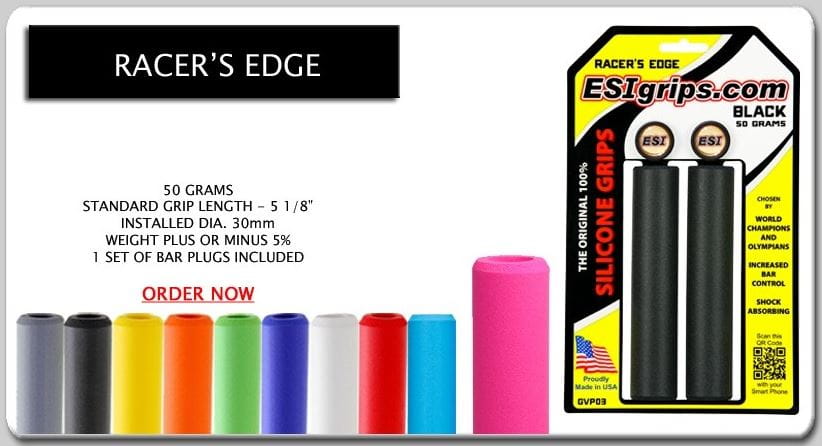 Chwyty Racer's Edge doskonale dopasowują się do dłoni tłumiąc nieprzyjemne wstrząsy i drgania. Gwarantują doskonałą przyczepność oraz kontrolę kierownicy zarówno w suchych jak i mokrych warunkach jazdy. Nie ślizgają się oraz nie kleją pomimo gładkiej powierzchni styku z dłonią. Doskonale układają się w dłoniach zmniejszając drętwienie rąk oraz przemęczenie ramion. Materiał z których wykonano gripy pomimo intensywnego użytkowania nie odkształcają się oraz nie blakną, pozostając jak nowe. Logo zostało umieszczone na zaślepkach. W celu zamontowania gripów należy odtłuścić powierzchnię kierownicy oraz przetrzeć w środku uchwyty preparatem na bazie alkoholu (np. płyn do szyb). Mokre gripy zakładamy na kierownicę (cieńszą stroną w kierunku dołu). Chwyty ESI należy pozostawić na co najmniej 24 h do wyschnięcia. Gripy można przycinać do odpowiedniej długości.