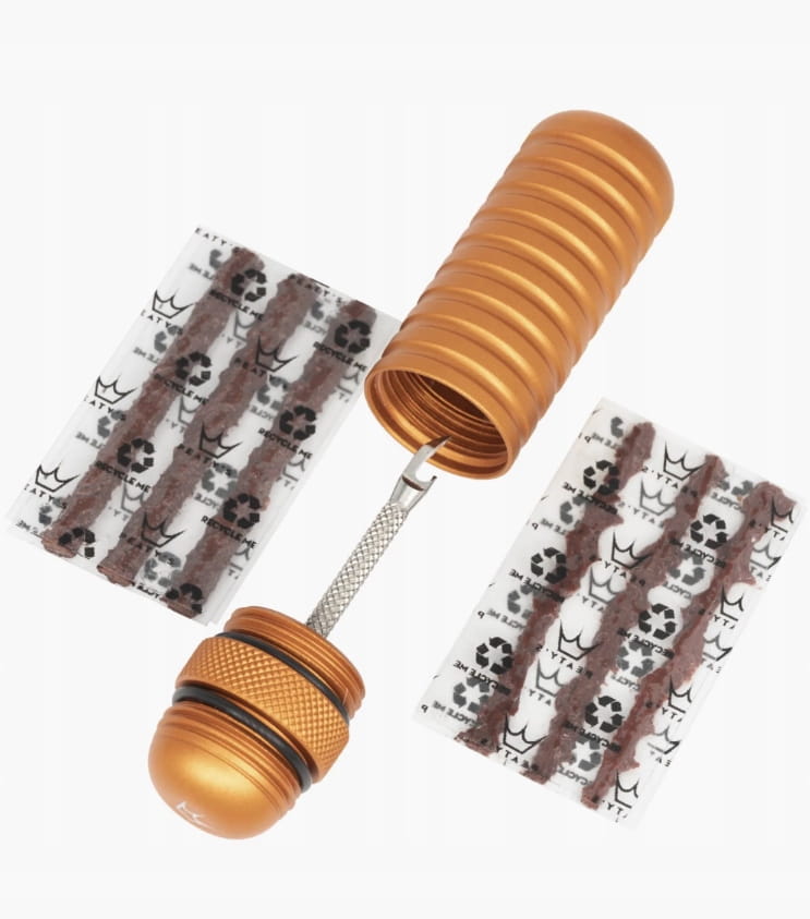 Wykonany z wysokiej jakości stali nierdzewnej 316 aplikator jest tak wąski jak to możliwe, dzięki czemu nie powiększa przebicia, a jego zredukowana długość ogranicza ryzyko uszkodzenia taśmy podczas użycia. Ma też naniesioną fakturę frezu, która oczyszcza przebicie podczas wkładania kołka. Dzięki niewielkim rozmiarom (65 x 19 mm) narzędzie to z łatwością zmieści się w kieszeni, uchwycie na ramę lub w plecaku.